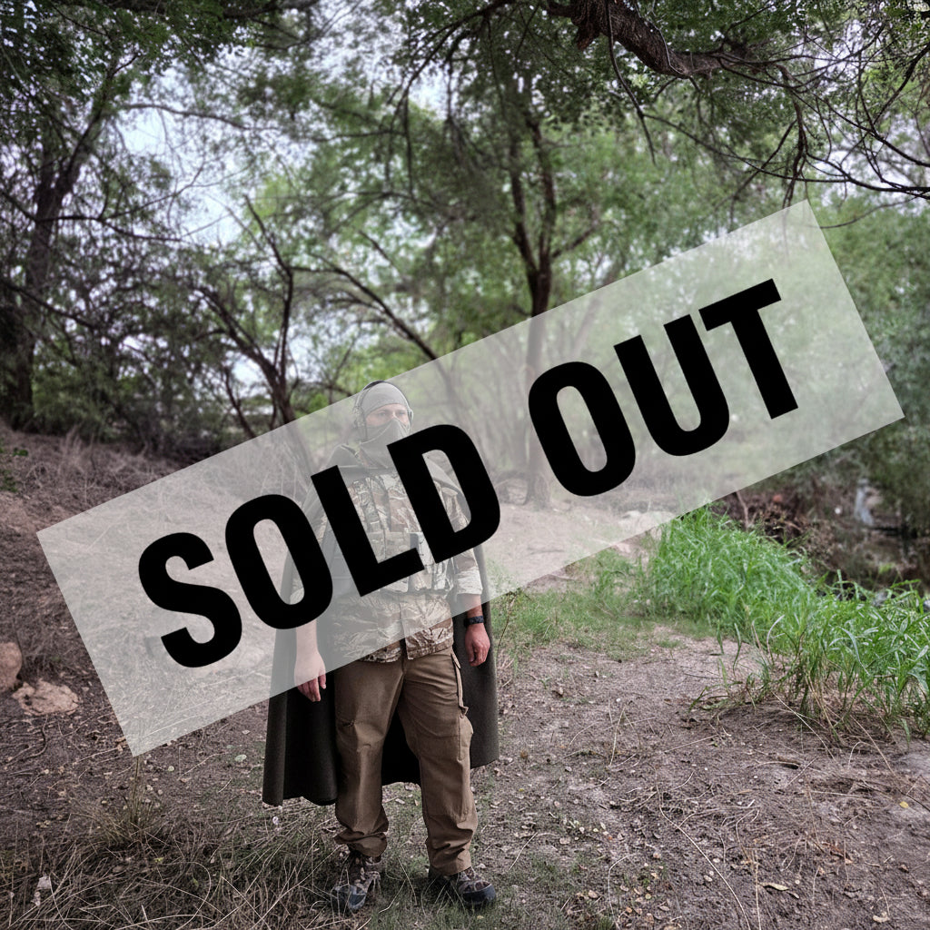 The heavy wool drape breaks up the human outline and slows heat buildup on thermal optics, adding what we call thermal delay; a brief distortion that buys time and softens the image to the human eye. Designed to confuse the watcher, not the thermal optic.