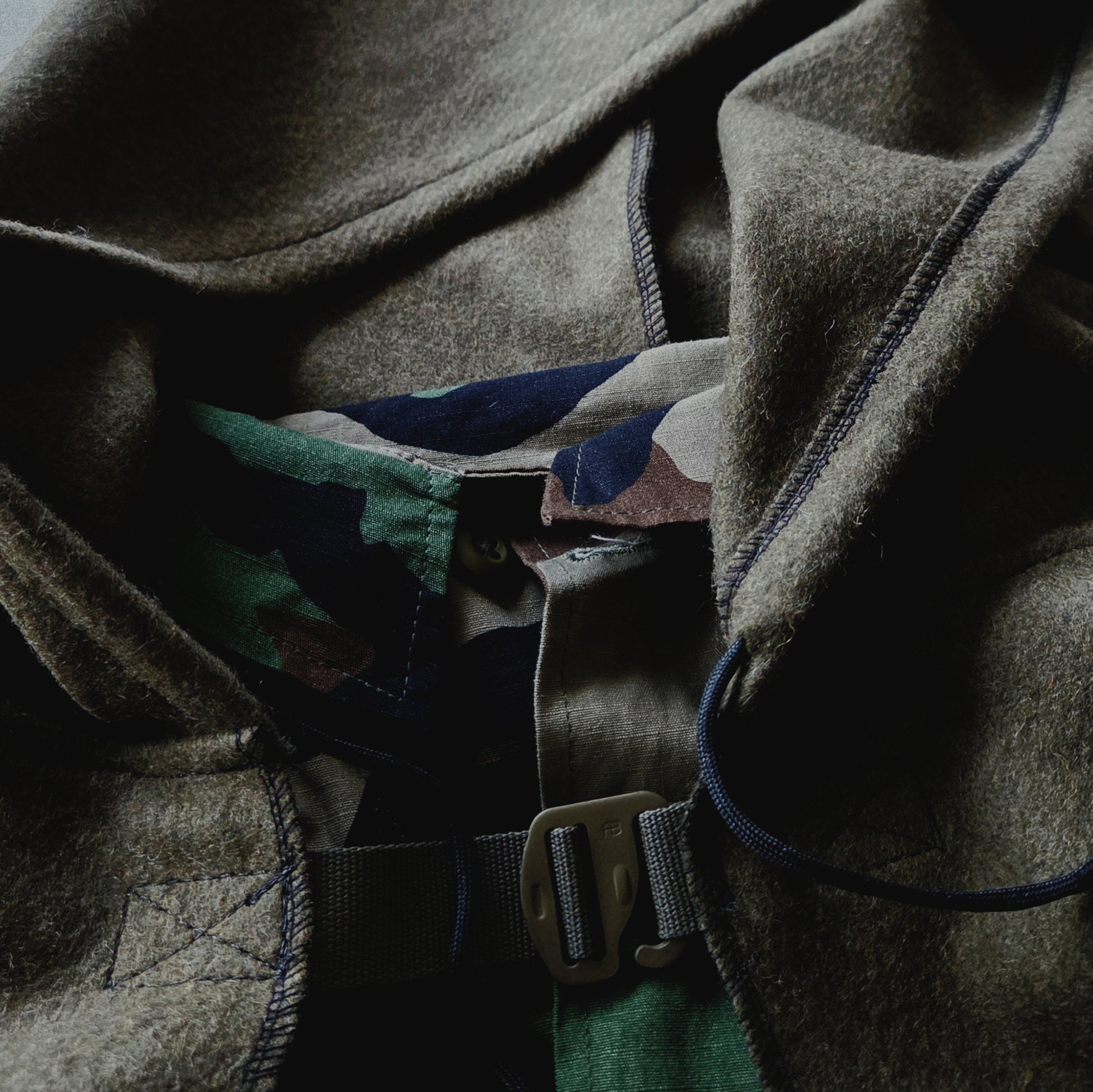 The oversized hood pulls low to hide the face or fits cleanly over a tactical helmet. A paracord drawstring runs through the channel for quick adjustment or field use when needed; a small nod to the way every part of this cloak serves a purpose. The adjustable G-hook clasp and ranger-green webbing close the front quietly and securely, built to move without clatter or shine.
